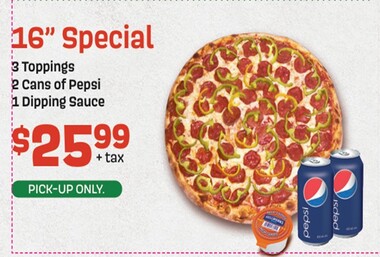 Get A Everyday Party Size Pizza, With 3 Dipping Sauces or 3 Cans of Pop For Only $29.29 Plus Tax Pick-Up Only At Ital Vera Pizza, 270 Chancellor Drive, Vaughan, ON, L4L 7M1, CA Call To Order 905-856-4140